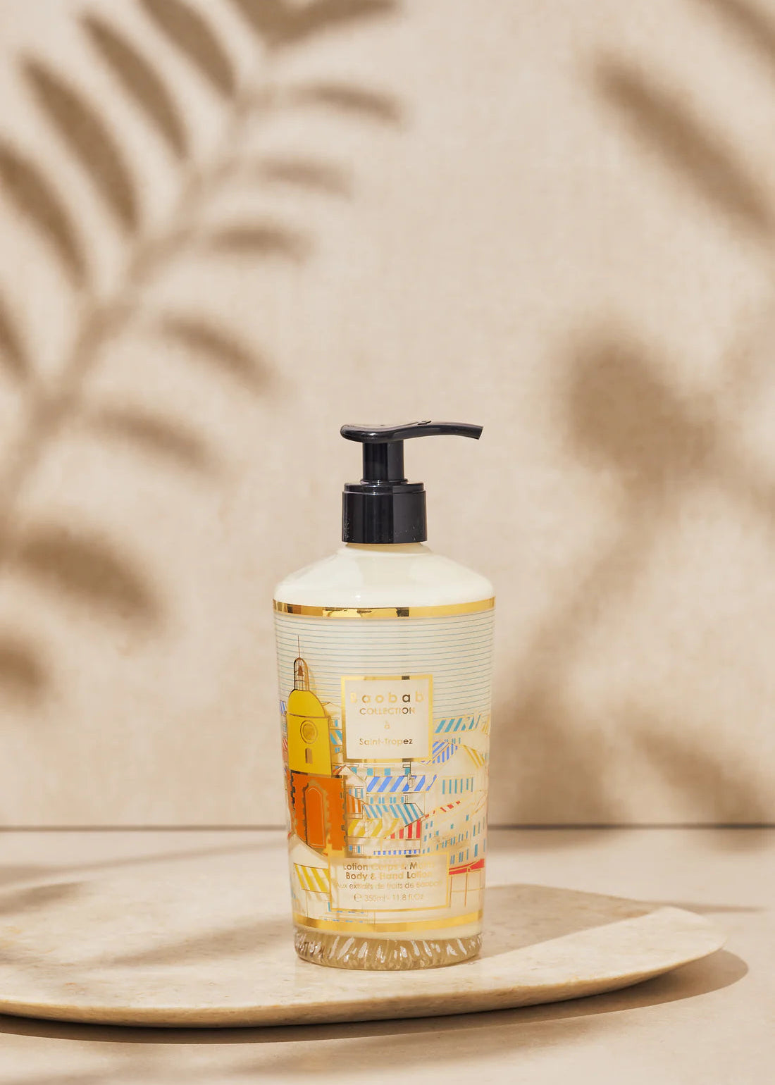 Le mythique village de Saint Tropez est représenté d’une façon stylisée sur le verre grâce au décor sérigraphié d’or et de couleurs. La lotion corps et mains devient un objet de décoration et l’on aperçoit en transparence la galénique délicatement colorée. La texture de la lotion est légère et s’applique comme une seconde peau dans un effet hydratant frais et réconfortant.