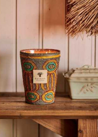 Recouverte d’un raphia crocheté à la main par une coopérative de femmes à Madagascar, la bougie parfumée Antongona est un objet de décoration aux couleurs subtiles de gris et de jaune safran et au motif inspiré de l’art aborigène représentant les lieux sacrés des grands espaces australiens.