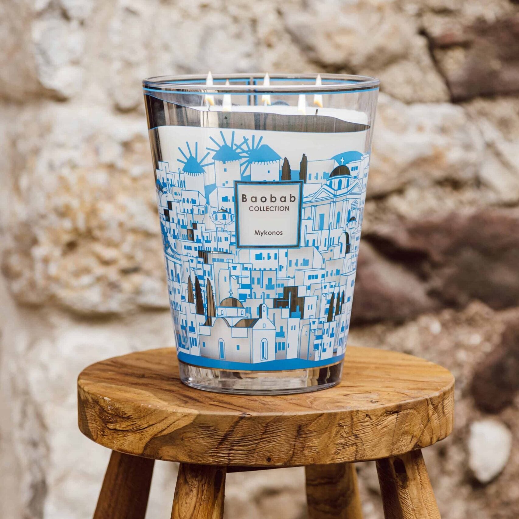 La bougie parfumée Mykonos est réalisée dans un verre recouvert d’une sérigraphie représentant le merveilleux village dont elle porte le nom. Le dessin stylisé a été posé à la main par nos artisans et recouvre la bougie d’un jeu de transparence mettant en valeur l’architecture du lieu. Son parfum de basilic, de jasmin et de patchouli vous emporte dans les effluves d’un été gorgé de soleil.