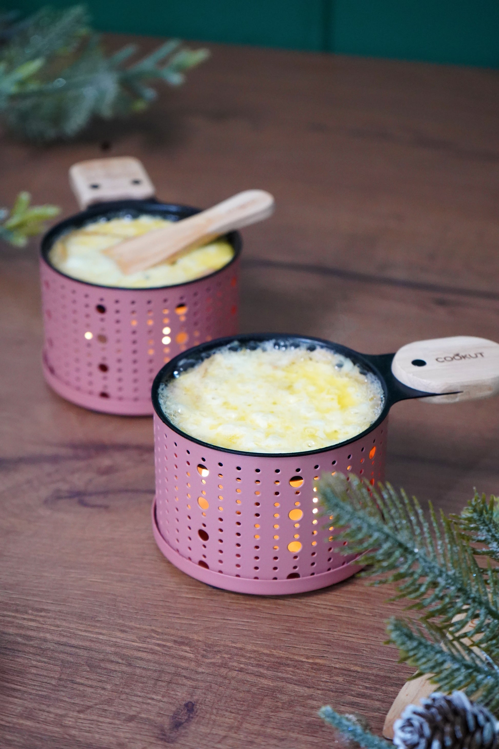 2 appareils raclettes à la bougie individuelles et 2 spatules en bois.
